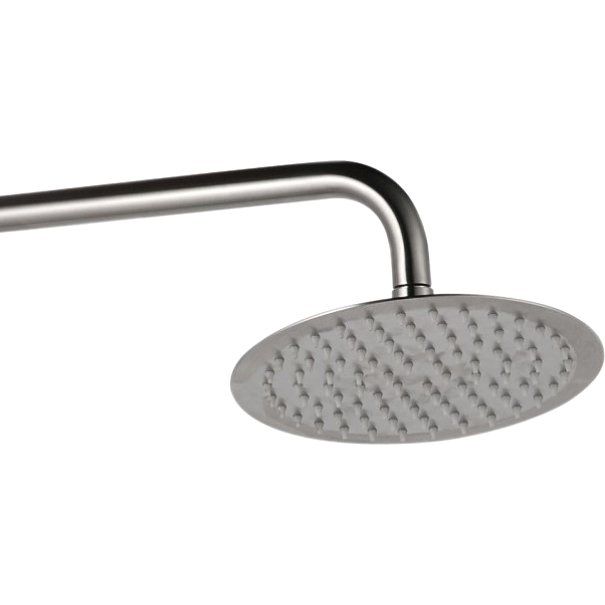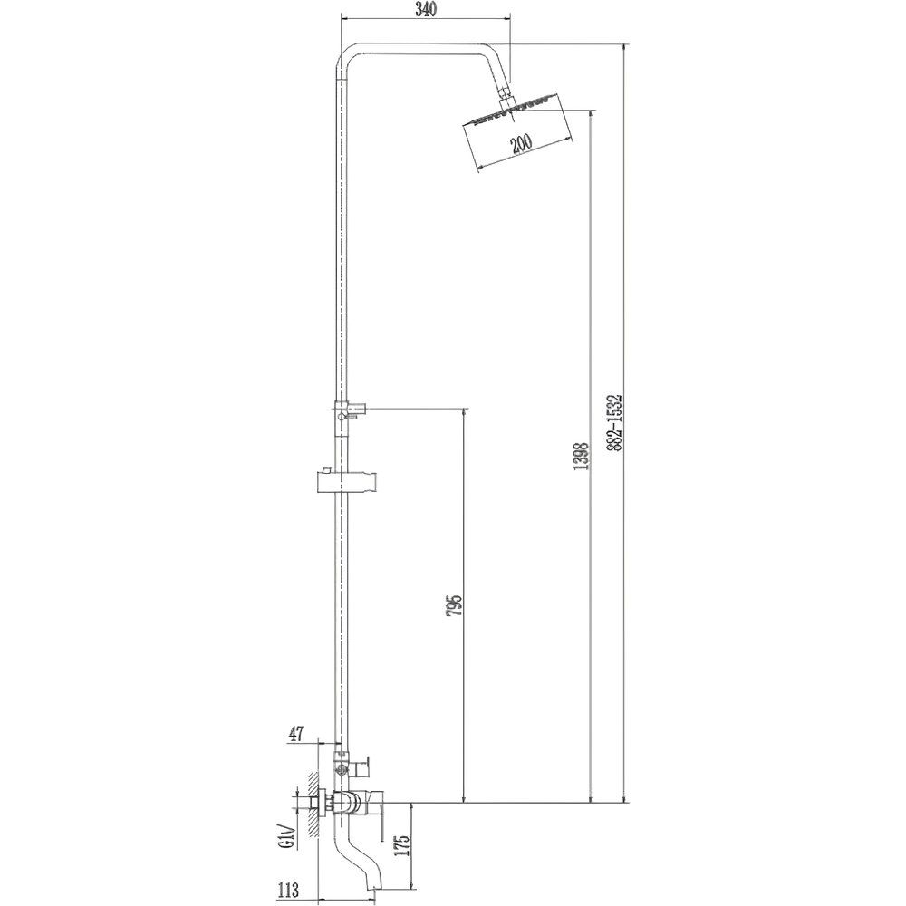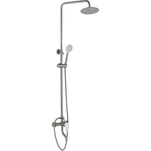 Душевая стойка имеет высоту 153,2 см и оснащена верхним душем диаметром 20 см с вылетом 34 см. Шланг длиной 150 см выполнен из металла и имеет специальные поворотные соединения, предотвращающие перекручивание. Смеситель выполнен с использованием керамического картриджа, что обеспечивает плавность регулировки и долговечность. В комплект входят душевая лейка, держатель для душа и эксцентрики.