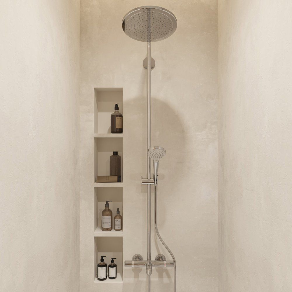 Душевая стойка Hansgrohe Croma Select 280 Air 1jet Showerpipe с термостатом сочетает в себе передовые технологии и изысканный дизайн в стиле хай-тек. Изготовленная из прочной латуни с хромированным покрытием, она прослужит вам долгие годы. Удобное управление душем осуществляется посредством вращения рукоятки. Верхний душ диаметром 28 см, с возможностью изменения угла наклона, служит идеальным решением для небольших душевых кабин. Благодаря термостату Ecostat Comfort, температура и напор воды остаются постоянными, а ограничитель до 40 °C защитит вас от ожогов. Функция RainAir подарит ощущение природного ливня с мягкими каплями, обогащенными воздухом, при этом оставаясь экономичной в расходе воды. Легкость ухода за изделием обеспечивается специальными силиконовыми форсунками, которые достаточно протереть рукой, чтобы избавить от известкового налета.