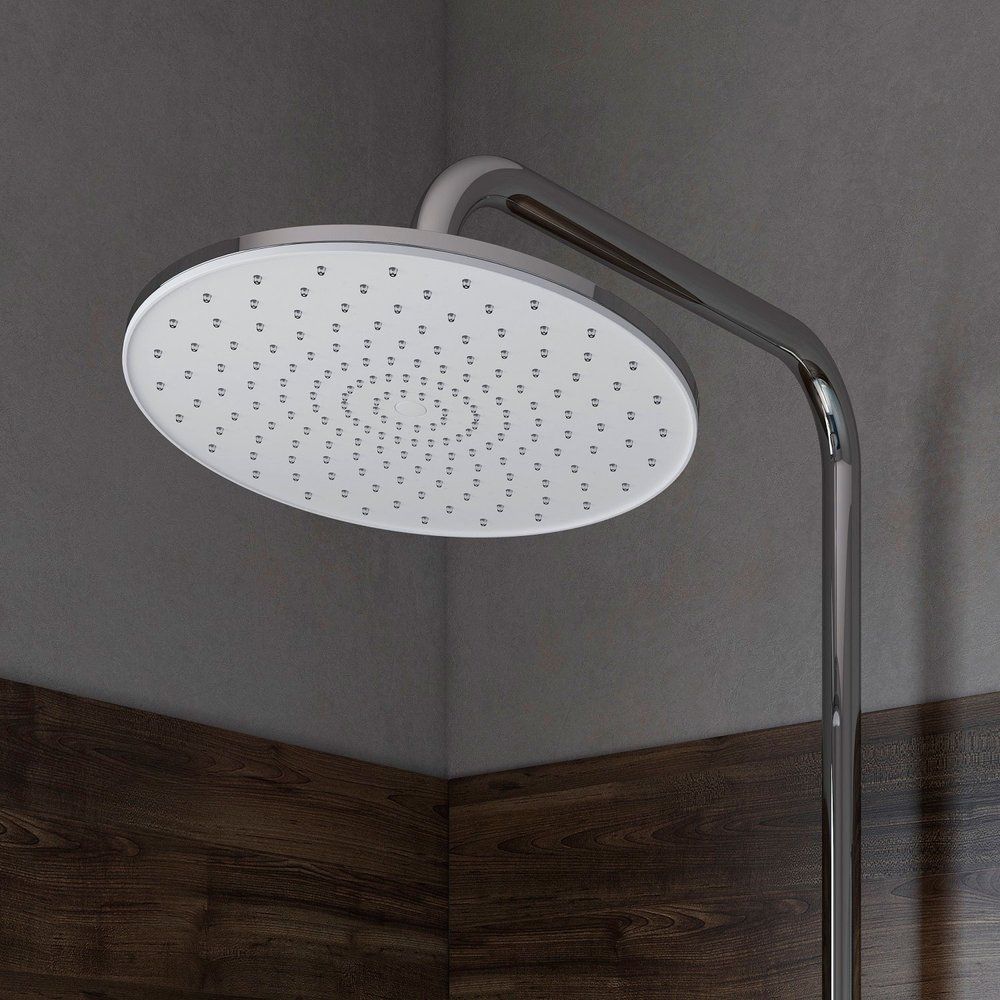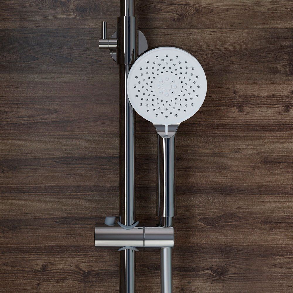 Высота душевой стойки составляет 150,4 см, что обеспечивает удобство использования для всей семьи. Латунный каркас дополнен пластиковыми элементами, которые предлагают идеальный баланс между устойчивостью и легкостью. Верхний душ диаметром 23 см с вылетом 36 см станет вашим помощником в расслабляющих водных процедурах. Лейка диаметром 12 см предлагает три режима струи для адаптации к любым предпочтениям. Пластиковый шланг, длиной 150 см, оборудован механизмами, предотвращающими перекручивание, что делает процесс принятия душа еще более удобным. Встроенный керамический картридж и клапан защиты от обратного потока гарантируют безопасность и долговечность использования.