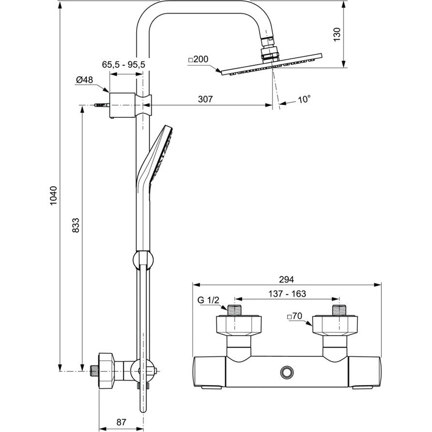 Душевая стойка Ideal Standard IdealRain cube evo оснащена настенным термостатическим смесителем Ceratherm 100, который поддерживает постоянную температуру воды и оснащен ограничителем при 40°C. Металлический держатель надежно крепится на стену, поддерживая изогнутую трубу и верхний душ с вылетом 30.7 см. Длина душевой трубы составляет 105.1 см, а шланг IdealFlex, предотвращающий перекручивание, — 175 см. Лейка диаметром 11 см предлагает три режима струи, а верхний душ впечатляет размерами 20х20 см. Вся система весит 5.28 кг и выполнена из качественной латуни, что гарантирует долговечность и устойчивость к коррозии.