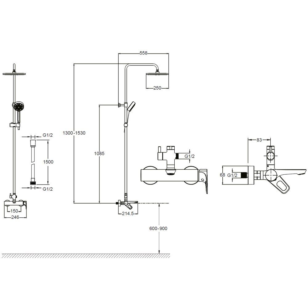 Душевая стойка имеет высоту 130 см и весит 4.8 кг. Верхний душ диаметром 25 см и с вылетом 43.3 см позволяет создать эффект "тропического дождя". Излив фирменной формы длиной 21.4 см фиксирован, а пластиковый шланг достигает 150 см в длину, обеспечивая большую свободу движений.