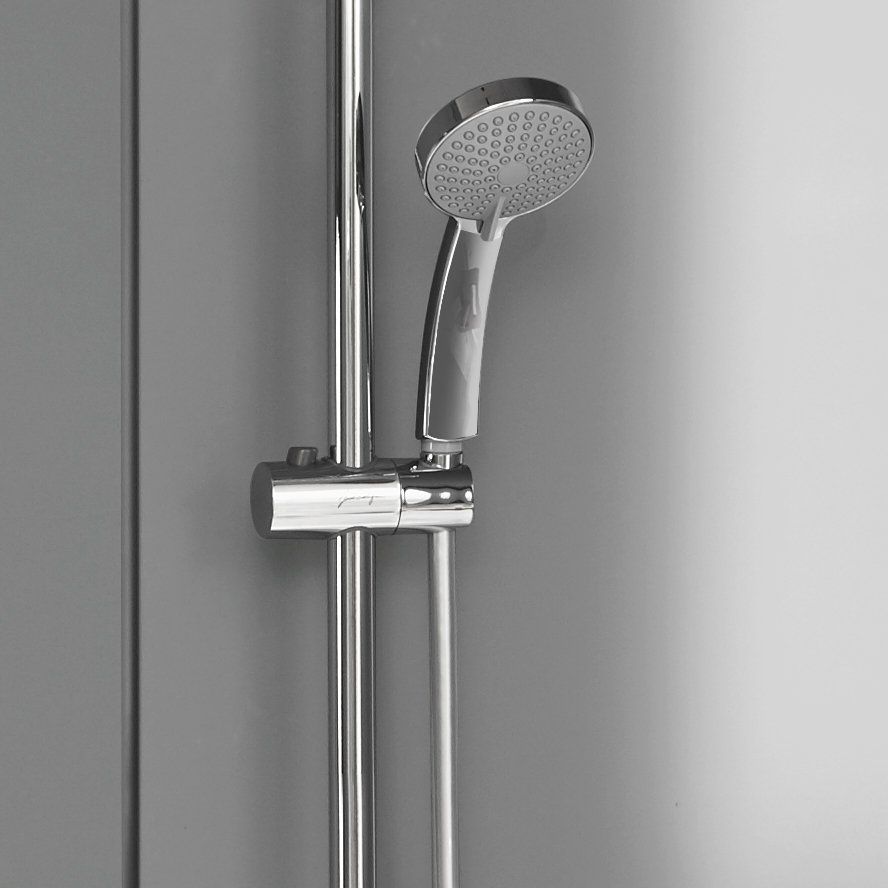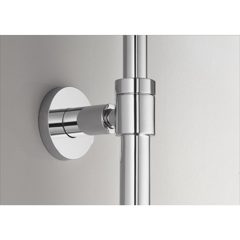 Jacob Delafon July E78192-CP имеет высоту 166.8 см и весит 5.4 кг. В центре системы — термостатический картридж, который управляет температурой воды. Верхний душ диаметром 20 см и вылетом 47.8 см обеспечивают обширное покрытие, а фиксированный излив длиной 18.4 см делает использование особо удобным. Душевой шланг длиной 160 см выполнен из пластика и снабжен системой, препятствующей перекручиванию благодаря поворотным конусам.