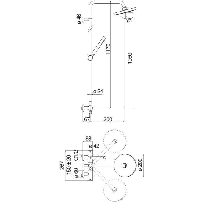 - Одноструйный ручной душ и Шланг длиной 150 см