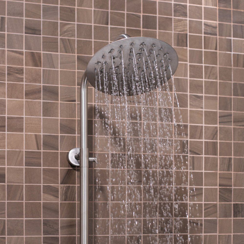 Душевая стойка имеет высоту 100.3 см и весит 3.05 кг. Верхний душ с диаметром 20 см и вылетом 37 см обеспечивает комфортное распределение воды. Лейка с одним режимом струи и без излива предлагает простой и функциональный душ. Металлический шланг долговечен и надежен. Система оснащена переключателем потоков и эксцентрики для удобства пользования.