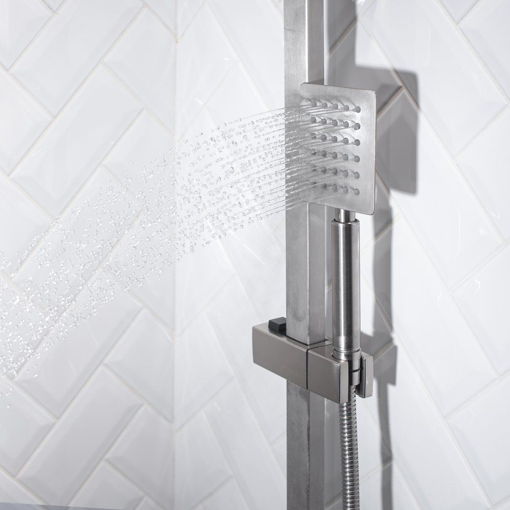 Душевая стойка имеет высоту 122 см и весит 3.7 кг. Она изготовлена из нержавеющей стали, что гарантирует её долговечность и стильный внешний вид. Верхний душ диаметром 26 см удобно направлен с вылетом в 37 см, а лейка с одним режимом струи имеет размер 10 см — идеальное сочетание для приятных водных процедур. Длина металлического душевого шланга — 150 см, и он дополняется переключателем потоков и аэратором для максимальной эффективности. Также в комплект входят удерживающий душ держатель, эксцентрики и керамический картридж для улучшенного функционирования.