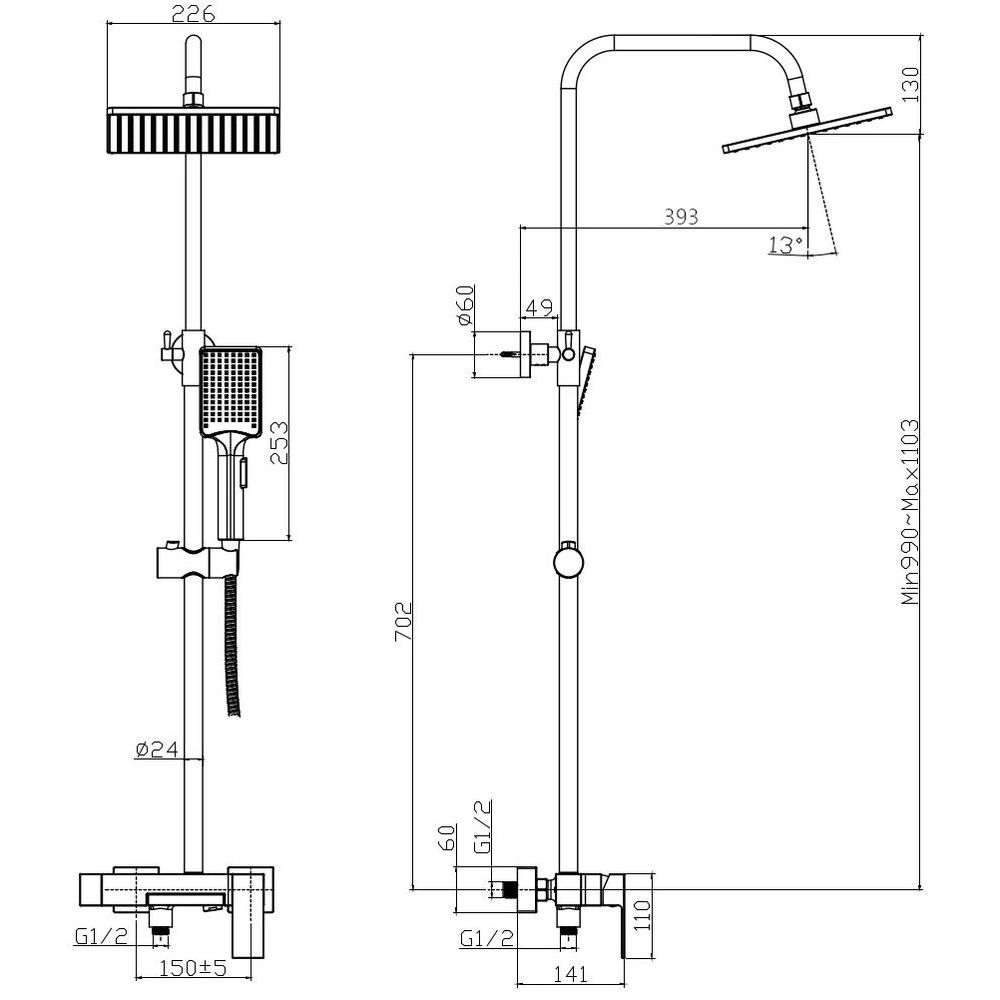 - Верхний душ, встроенный в крышу, и регулируемая высота ножек для идеальной установки.