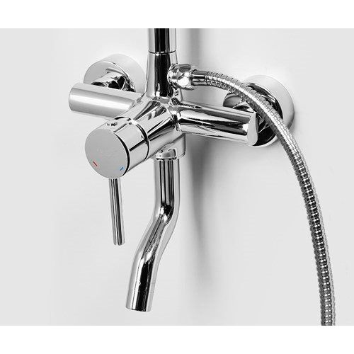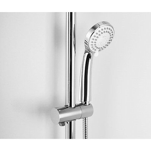 Верхний душ размером 25 см и с вылетом 45 см, оснащенный 135 силиконовыми форсунками, регулируется под наклоном от 0 до 22 градусов. Душевая лейка диаметром 8.1 см предлагает три режима струи и подключена к металлическому шлангу длиной 150 см. Излив длиной 9.8 см с углом поворота 90° переключает поток воды между основным душем и леей. Душевая стойка регулируется по высоте от 84 до 125 см и рассчитана на рабочее давление от 1 до 5 бар, выдерживая максимум до 9 бар. Температурные диапазоны варьируются от 65 до 90 °C, а керамический картридж обеспечивает длительный срок службы до 500 000 циклов.