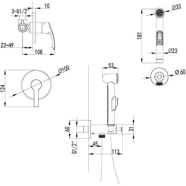 Комплект включает смеситель и скрытую внутреннюю часть для удобной установки. Гигиенический душ изготовлен из высококачественной латуни с глянцевым покрытием, защищенным от коррозии и механических повреждений. Устройство оснащено керамическим картриджем и рычажным управлением. Длина шланга составляет 150 см, а компактная лейка имеет диаметр 3.3 см. Подключение осуществляется с подводкой 1/2. Комплект включает в себя душевой шланг, держатель для душа и шланговое подключение. Изделие имеет гарантию на 4 года.