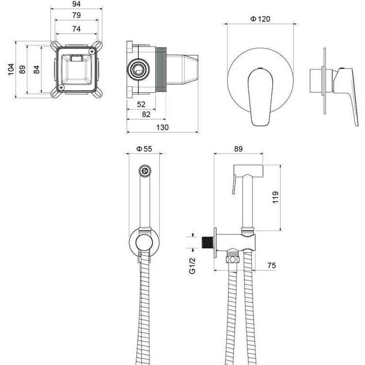 • Душевой шланг 1,2м из нержавеющей стали• Однорычажная система регулировки силы струи и температуры воды