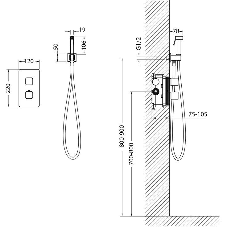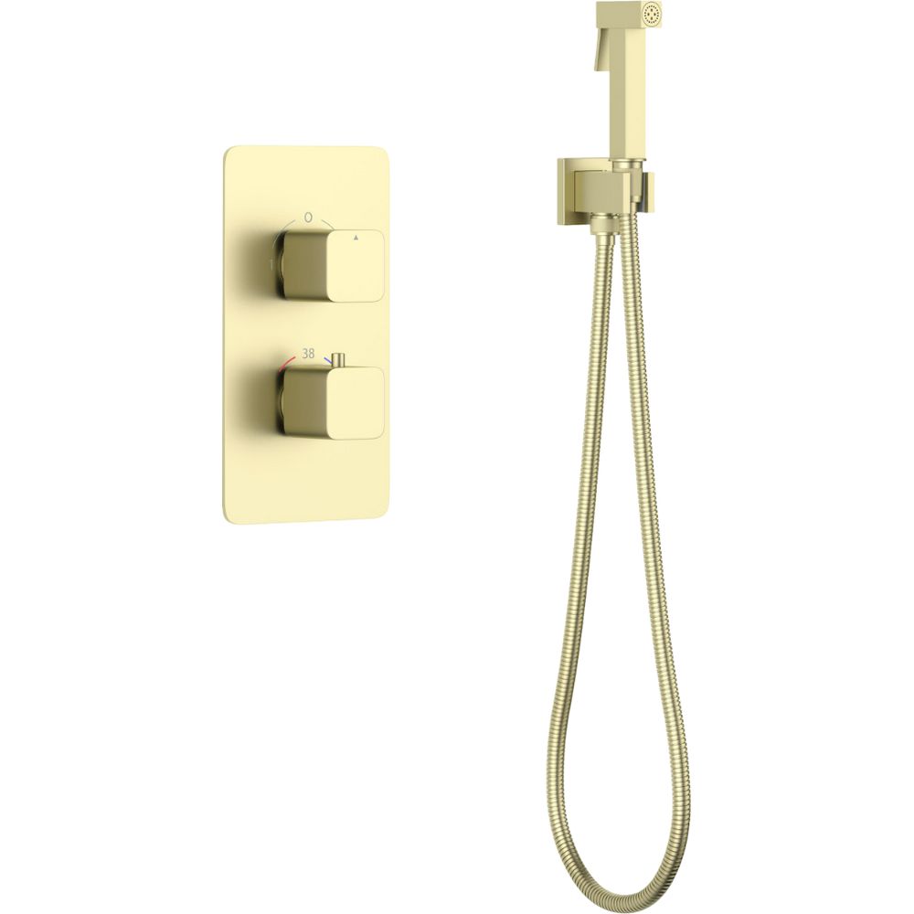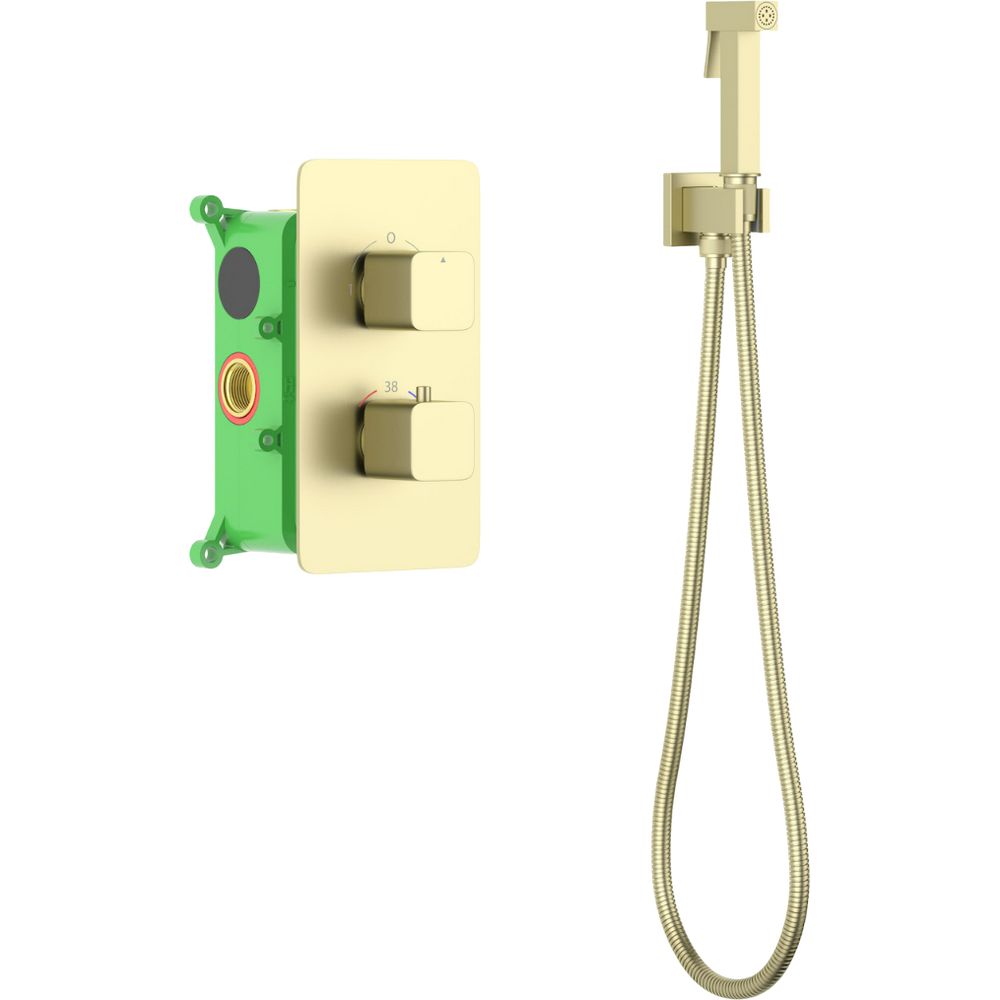 Этот комплект включает в себя гигиенический душ, смеситель с внутренней частью и держатель для душа. Латунный смеситель обладает термостатом, что создаёт дополнительные удобства в использовании. Металлический шланг длиной 120 см обеспечивает свободу движений и является частью полного комплекта, предназначенного для быстрого и лёгкого подключения.