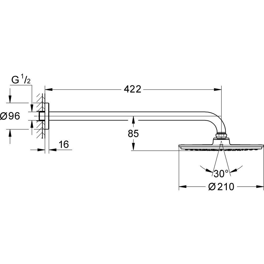 Верхний душ имеет размер 21 см, который обеспечивает оптимальный водный поток на значительной площади. Устройство легко монтируется на стену и имеет вылет в 42.2 см, что делает его идеальным выбором для любых ванных комнат. Система подводки 1/2 и легкость в очистке обеспечивают дополнительный комфорт в эксплуатации. Германия производитель гарантирует высокое качество своих изделий сроком на 1 год.