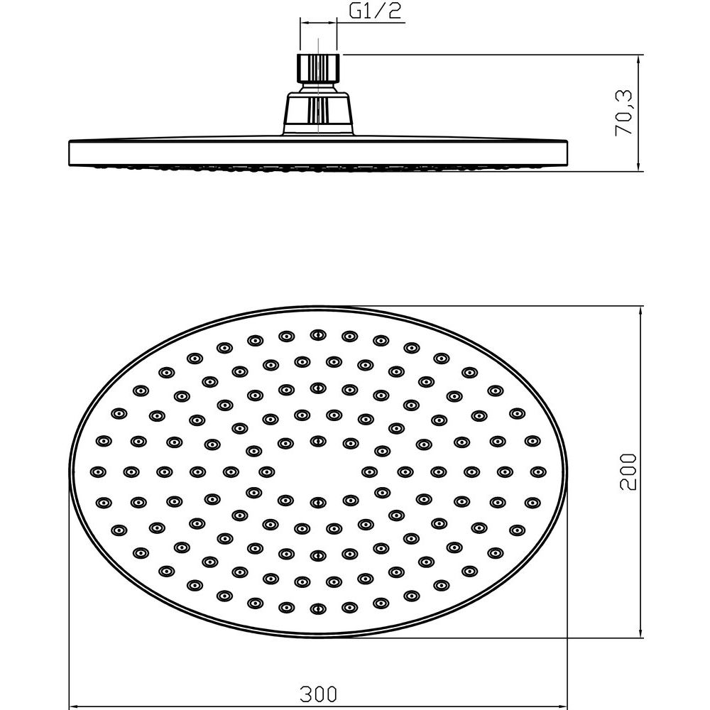 Размер верхнего душа составляет 30 см, что обеспечивает обширное покрытие водяным потоком. Он оснащён подводкой 1/2 дюйма, что делает его совместимым с большинством систем. Внутреннее антиизвестковое покрытие препятствует образованию налёта и облегчает уход за устройством.