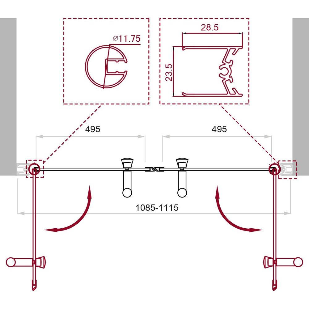 Размеры двери составляют 110x190 см, что делает ее универсальной для большинства стандартных ниш. Она может быть установлена как на напольное покрытие, так и на поддон, в зависимости от ваших предпочтений. Распашная система дверей позволяет им открываться как внутрь, так и наружу, что значительно повышает функциональность. Полотно двери сделано из 5 мм стекла, обеспечивающего надежную защиту и долговечность конструкции, а алюминиевый профиль с глянцевой отделкой подчеркивает современный стиль.