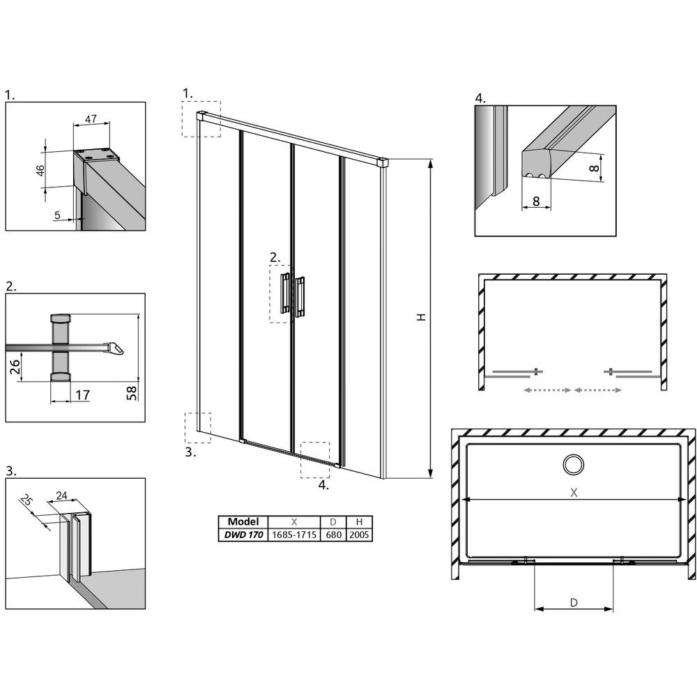 Габариты душевой двери составляют 170x200,5 см, что обеспечивает простор для комфортного пользования. Система раздвижных дверей позволяет легко и тихо открывать и закрывать их за счёт нижних ползунов. Прозрачное стекло толщиной 6 мм дополнено алюминиевым профилем с матовой поверхностью, что добавляет современности и стиля. Опция регулировки ширины позволяет настроить дверь под особенности вашей ниши, обеспечивая ширину входа 68 см.