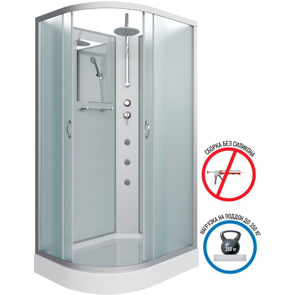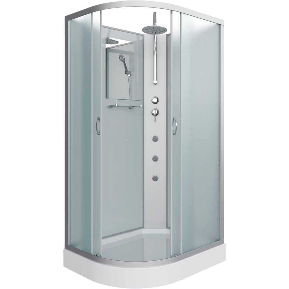 Душевая кабина оснащена раздвижной системой дверей из стекла с матовым покрытием, обеспечивая достойный уровень приватности. Ширина входа составляет 48 см, что достаточно для комфортного перемещения. В кабинке предусмотрены встроенное зеркало и полка для дополнительных удобств. Поддон, выполненный из прочного и легкого АБС-пластика, имеет глубину 5 см и регулируемые ножки для компенсации неровностей пола. Кабина также включает сифон, экран и душевой гарнитур в комплекте.