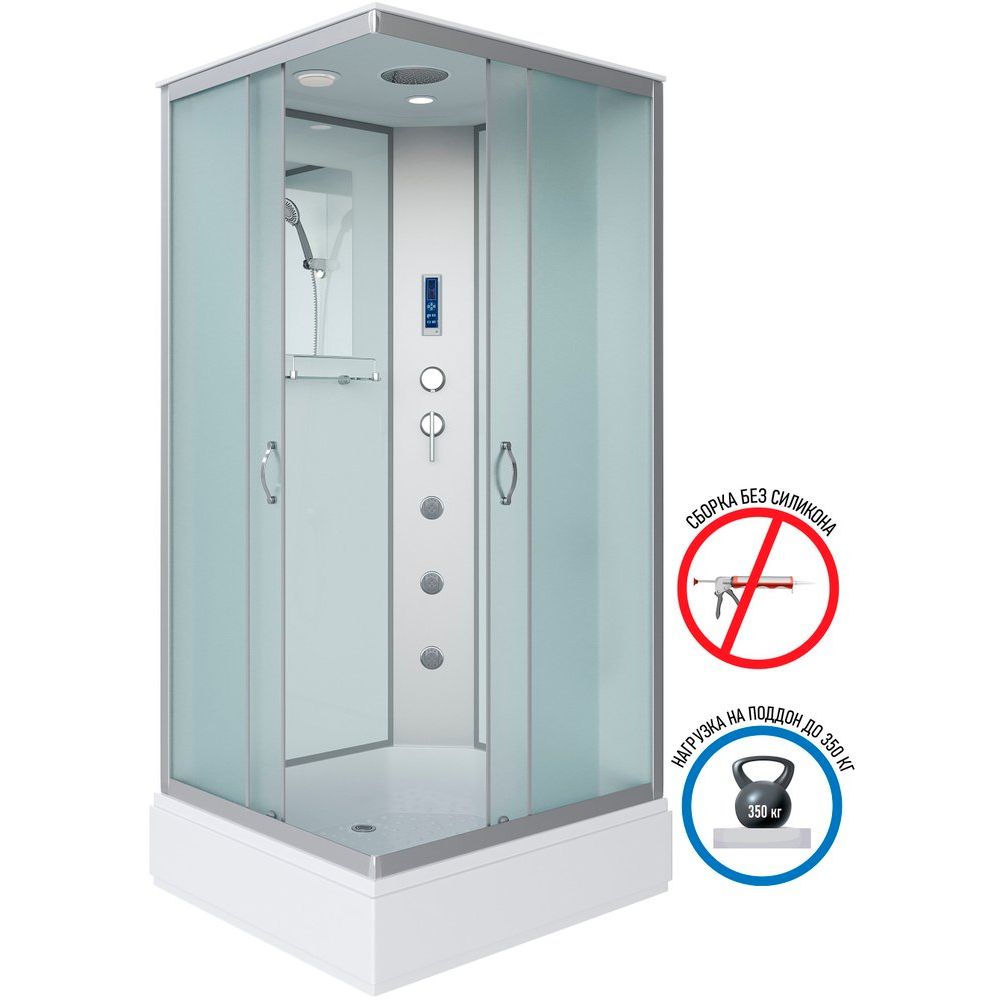 Габариты кабины составляют 90x80 см, что делает ее подходящей для большинства ванных комнат. Верхний душ встроен в крышу кабины, а сзади предусмотрен гидромассаж спины. Раздвижная система дверей обеспечивает удобный вход шириной 40 см, при этом двери изготовлены из стекла с матовым полотном, что придает изделию стильный вид. Кабина оборудована электронным управлением и оснащена встроенным зеркалом и полкой. Глубина поддона составляет 13 см, что вместе с антискользящим покрытием гарантирует комфорт и безопасность. Поддон крепкий, из АБС-пластика, с регулируемой высотой ножек для учета неровностей пола. В комплект входит сифон, экран и душевой гарнитур, а встроенное радио и вентиляция подчеркнут вашу заботу о комфорте.