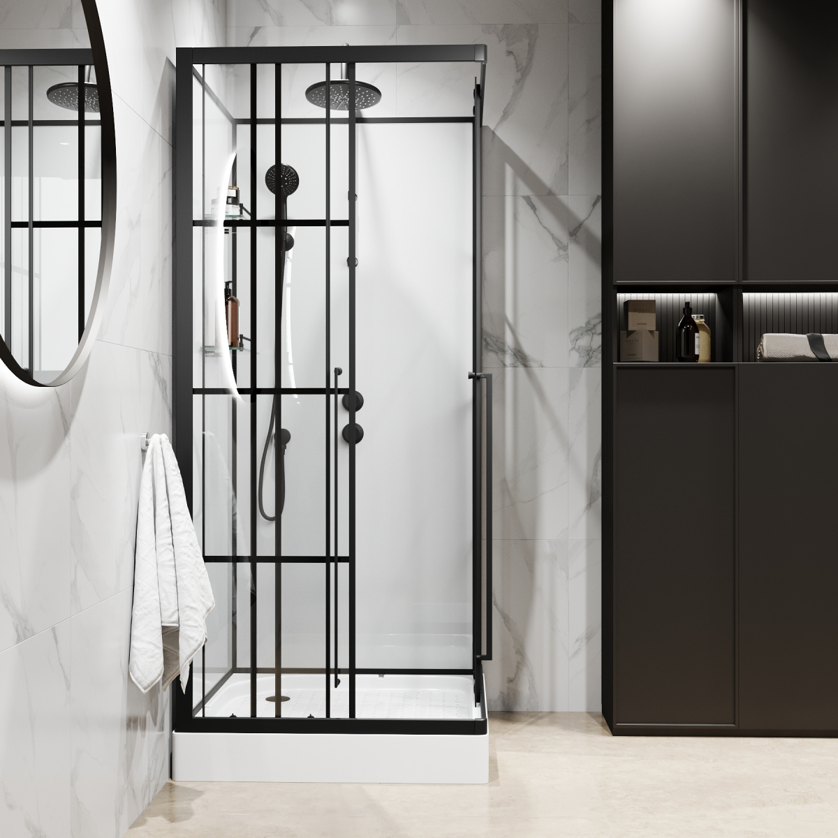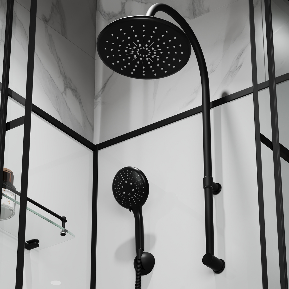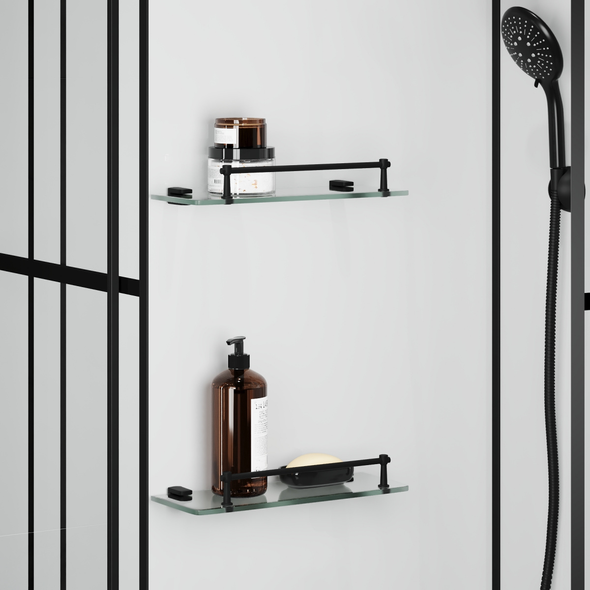 Кабина оснащена двумя полочками, ручной лейкой и специальными роликами из стали для долгой службы. Передние стенки украшают прозрачные стеклянные панели с оригинальным принтом, защищающие от скольжения.