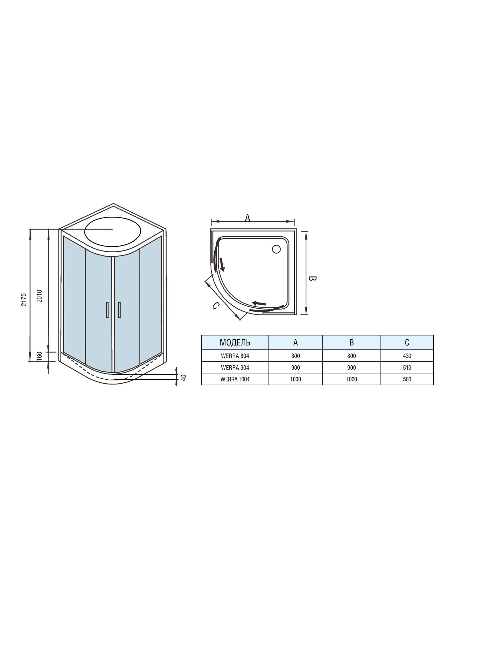 WeltWasser WERRA 1004 – качественная душевая кабина с богатым функционалом, привлекающая простотой в эксплуатации. Конструкция оснащена универсальной дверью, которая после установки раздвигается влево и вправо. Передние и боковые стенки кабины выполнены из надёжного и прочного закаленного стекла толщиной 5 миллиметров. Ему не страшны перепады температур, случайные удары. Задняя стенка изготавливается из идентичного стекла, но окрашивается в белую цветовую гамму. В зависимости от собственных предпочтений, человек может пользоваться ручным душем, выбирая наиболее оптимальное для себя положение, либо верхним. Верхний LED свет создает приятное освещение внутри кабины. Сенсорный пульт оснащен функцией bluetooth и вы можете наслаждаться любимой музыкой с телефона. Смеситель Термостат поможет выбрать и зафиксировать оптимальную температуру для принятия душа. Две регулируемые гидромассажные форсунки сделают приятный массаж. Монтаж кабины осуществляется без силикона. Внутри конструкции свободно помещается высокий человек, ведь её внутренняя высота составляет два метра.