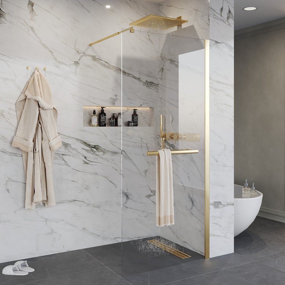 - Элегантный золотой профиль, который придаёт ванной комнате роскошный вид.