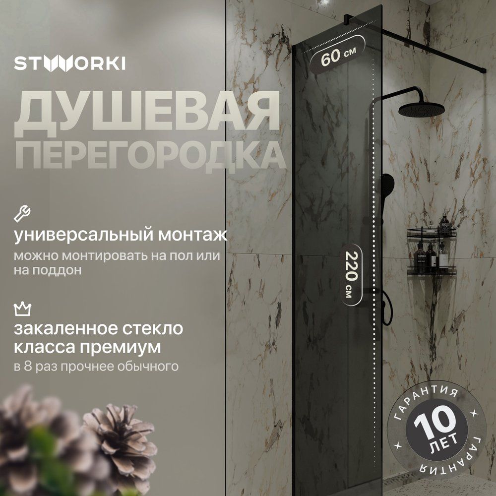 Данная душевая перегородка имеет габариты 60х220 см и подходит для напольного монтажа. Универсальная ориентация позволяет установить перегородку в любом удобном месте. Толщина тонированного полотна составляет 8 мм, что гарантирует прочность и надежность конструкции. Брэнд STWORKI предоставляет гарантию на 1 год. Произведено в России.