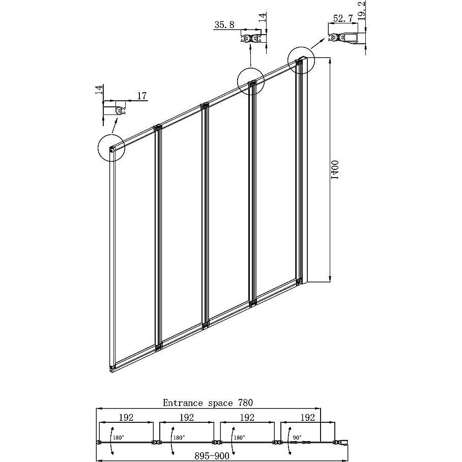 Шторка имеет размеры 90x140 см и подходит для правой установки. За счёт толщины двери в 4 мм вы получаете высокую прочность и устойчивость к повреждениям. Профиль выполнен из анодированного жаропрочного алюминия, который предотвращает образование коррозии благодаря оксидному слою. Складная система дверей и прозрачное полотно обеспечивают комфорт и удобство в использовании. Дополнительное покрытие «антикапля» способствует тому, чтобы вода не задерживалась на поверхности.