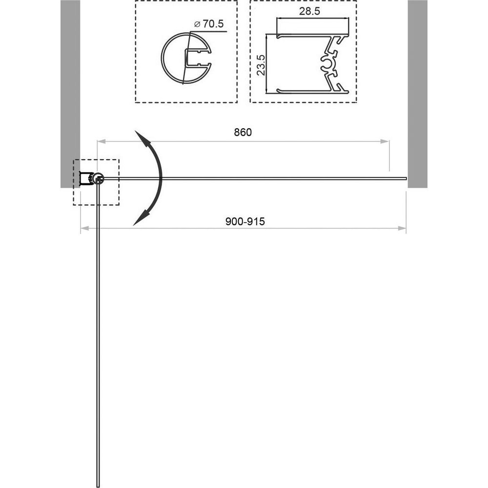 Шторка на ванну имеет габариты 90x150 см и состоит из прочного закаленного стекла толщиной 5 мм, соответствующего стандарту EN12150-1:2000. Алюминиевый профиль выполнен по стандарту DIN17611 2007 и обладает анодированной отделкой. Регулируемая ширина шторки от 90 до 91,5 см позволяет адаптироваться к различным ваннам. Распашная система дверей обеспечивает удобство, позволяя открывать дверь как внутрь, так и наружу.