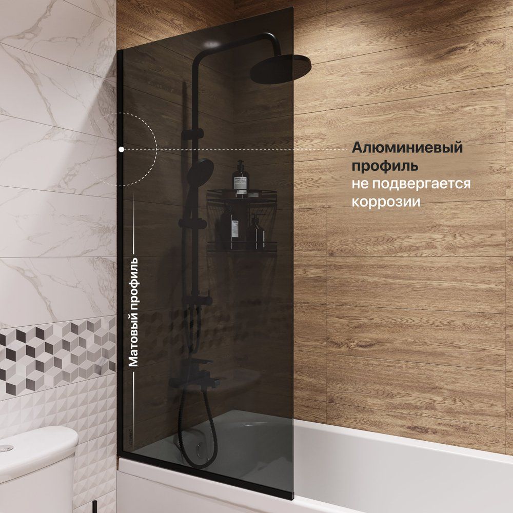 Шторка на ванну обладает габаритами 70x140 см, что делает её идеально подходящей для компактных ванных комнат. Полотно двери изготовлено из прочного тонированного стекла толщиной 8 мм, обеспечивая как стиль, так и надежное использование. Алюминиевый профиль выполнен в черном матовом цвете, что создает эффектный контраст и подчеркивает современный стиль вашего интерьера. Поскольку все части конструкции неподвижны, это обеспечивает дополнительную устойчивость и безопасность.