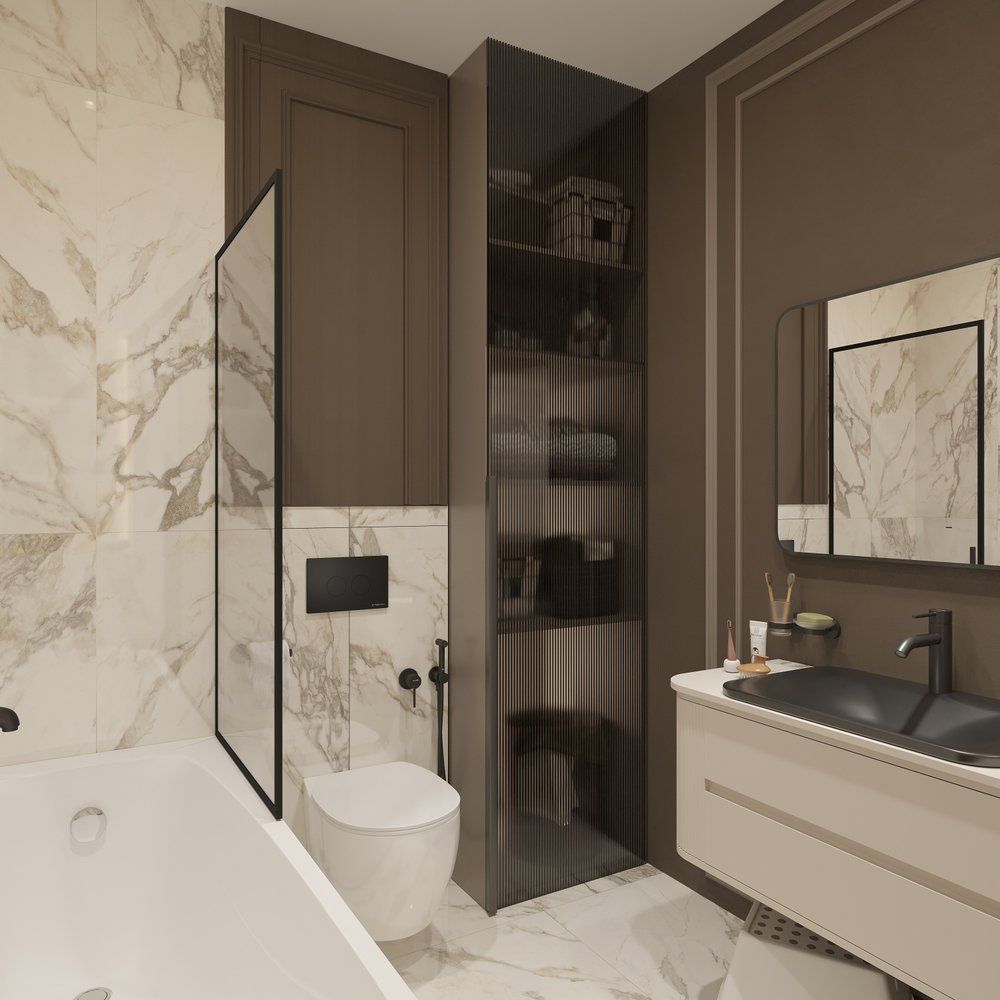 - Элегантный матовый черный профиль, придающий современный вид ванной комнате.
