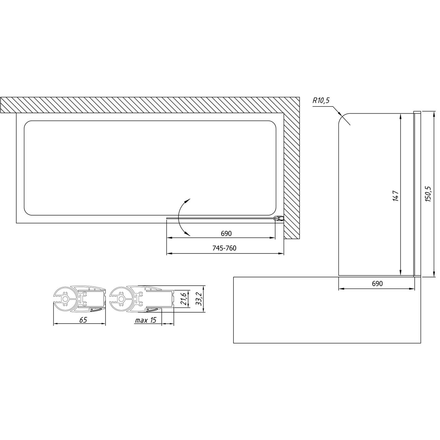 Габариты шторки составляют 76x150,5 см, а распашная система дверей предоставляет комфортный вход шириной 70 см. Полотно из стекла толщиной 6 мм добавляет надежности, сохраняя при этом лёгкость конструкции. Алюминиевый профиль изделия подчеркивает его качество и долговечность. Регулируемая ширина позволяет точно настроить ограждение под индивидуальные размеры вашей ванны. Модель имеет правую ориентацию и открывается как внутрь, так и наружу, что делает её универсальной для любой ванной комнаты.