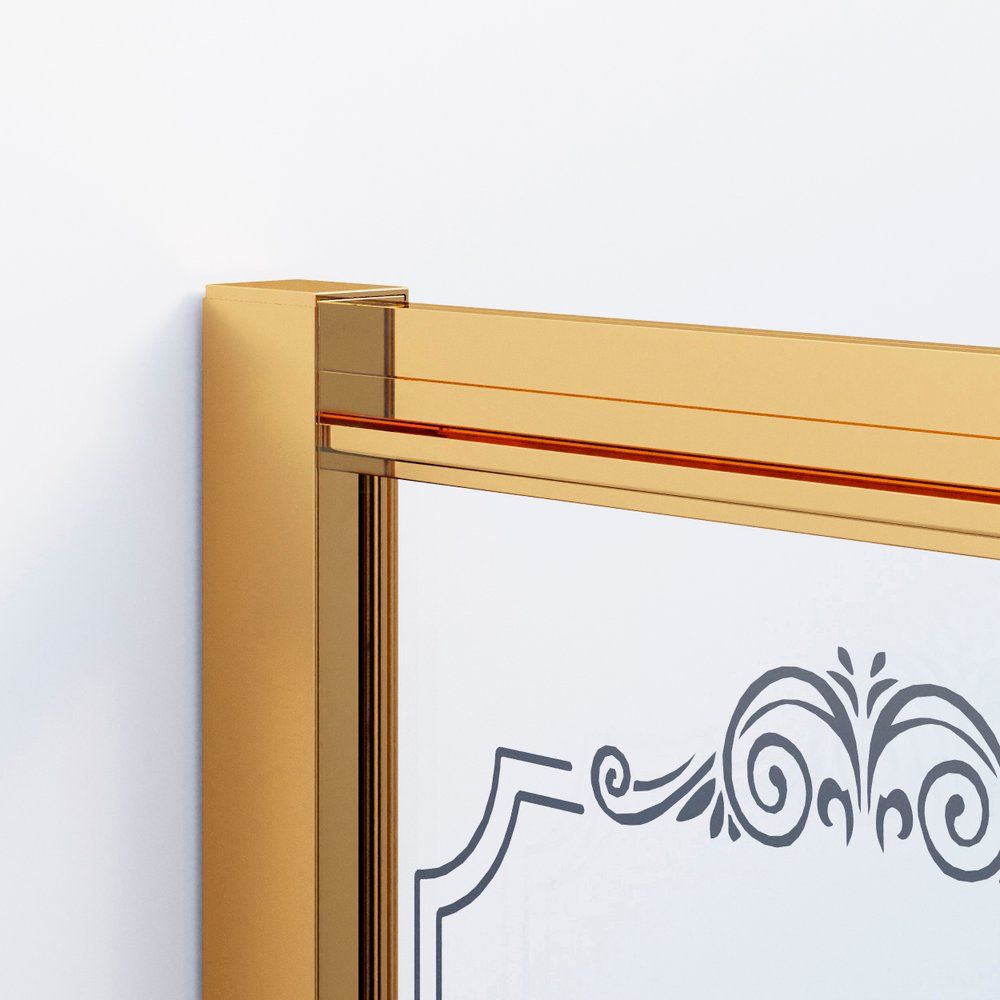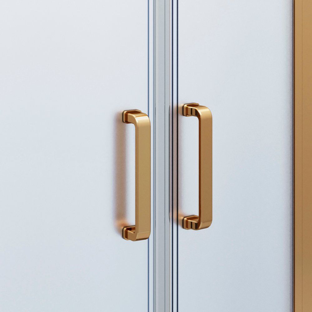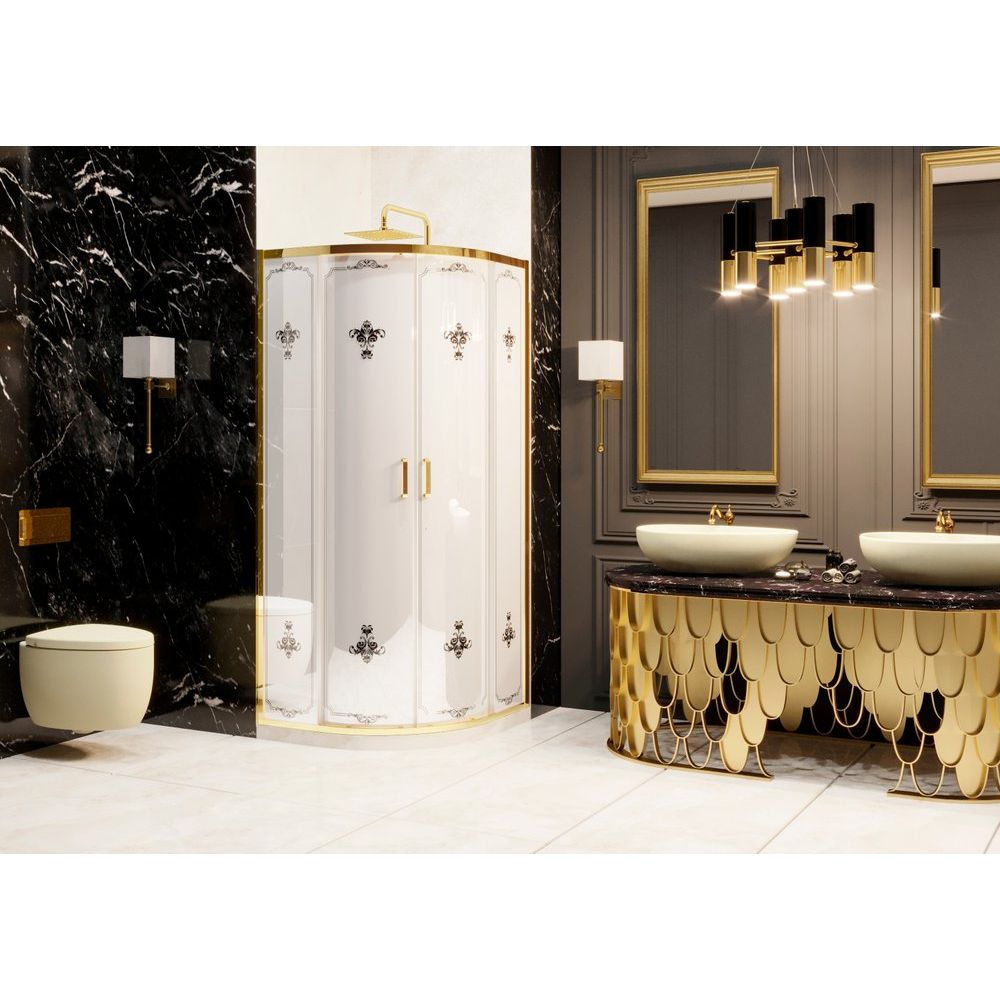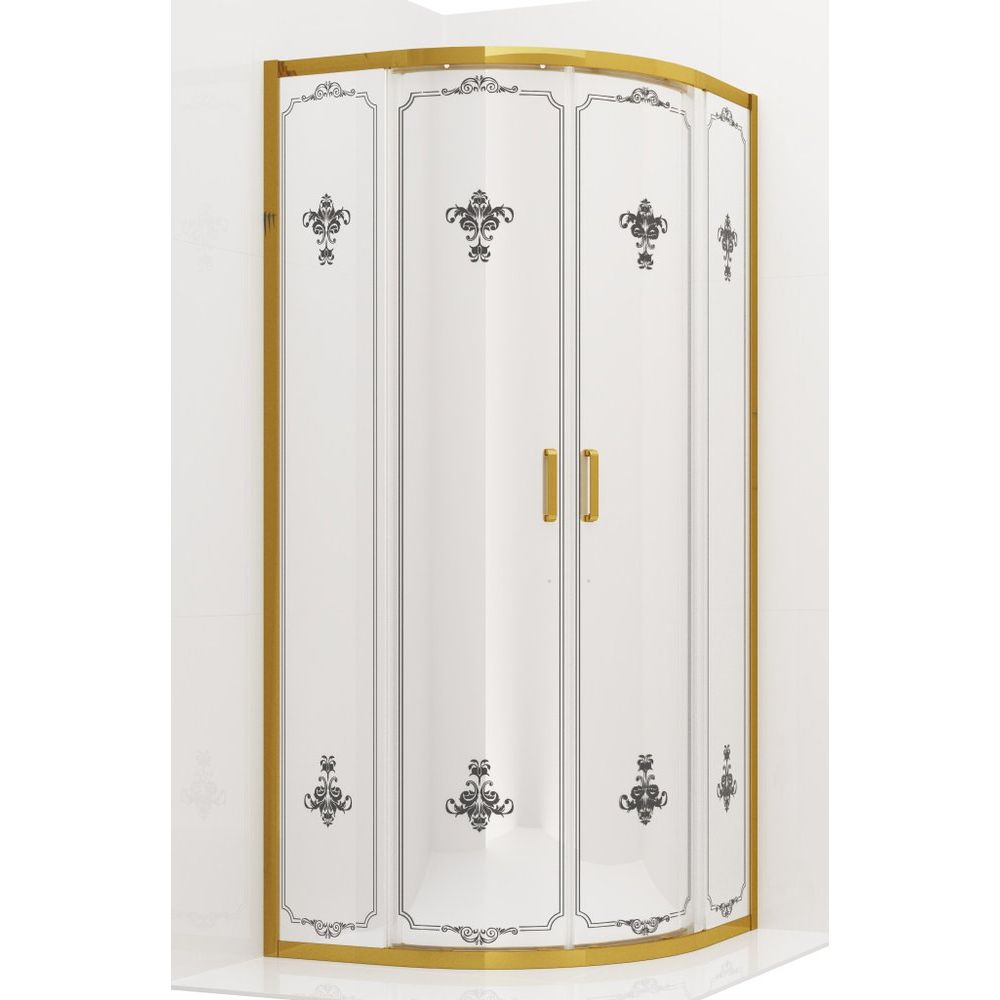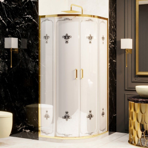 Душевой уголок с габаритами 100х100 см и регулируемой шириной от 98.5 до 100 см предлагает разнообразные варианты установки, включая монтаж прямо на пол без использования поддона. Раздвижная система с тонированными дверями и декоративным рисунком добавляет стильности, обеспечивая при этом просторный вход шириной 55 см. Алюминиевый профиль с глянцевой золотой отделкой подчеркивает эстетику интерьера.