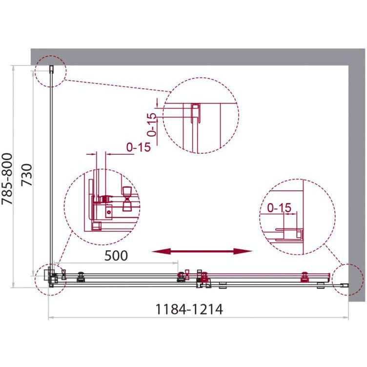 - Размеры душевого уголка: 121,4x80 см, ширина входа составляет 50 см.