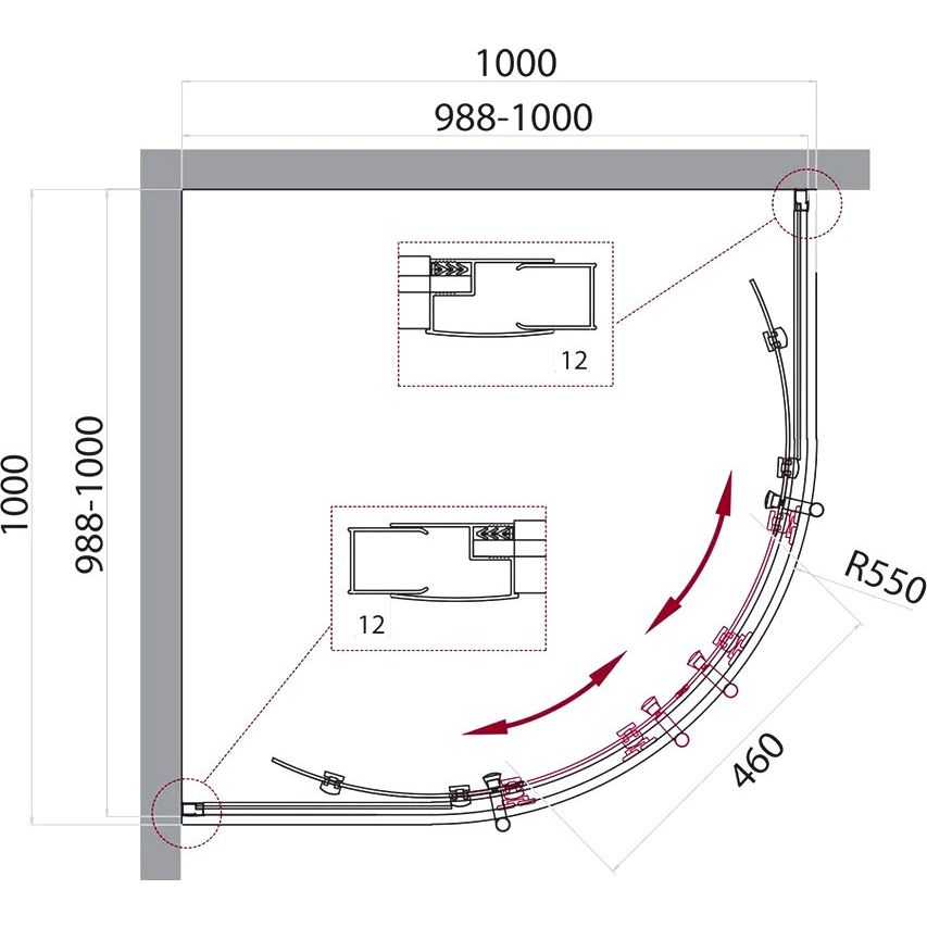 Душевой уголок обладает габаритами 100x100 см, что позволяет разместить его в любой ванной комнате. Вход шириной 46 см обеспечивает комфортное использование. Ширина конструкции может быть отрегулирована на несколько сантиметров для идеальной подгонки под ваш интерьер. В комплект входят надежные алюминиевые профили с хромированной глянцевой отделкой. Уголок предлагает напольный или пристенный монтаж в угол ванной комнаты, в зависимости от ваших предпочтений.