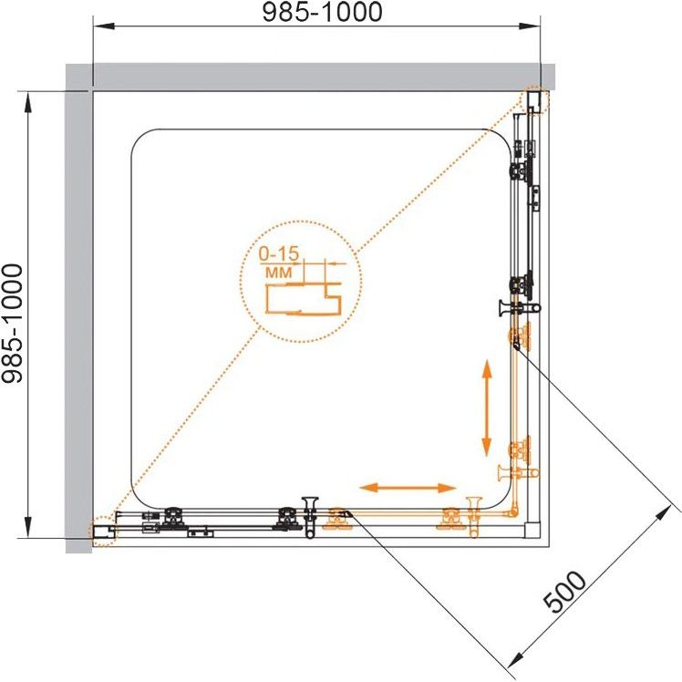 Душевой уголок имеет размер 100х100 см и оснащен регулируемым профилем, который позволяет изменять ширину в пределах нескольких сантиметров для идеальной установки. Ширина входа составляет 50 см — это обеспечивает удобный доступ. Благодаря раздвижной системе дверей и крепкому алюминиевому черному профилю, уголок не только функционален, но и привлекателен внешне.