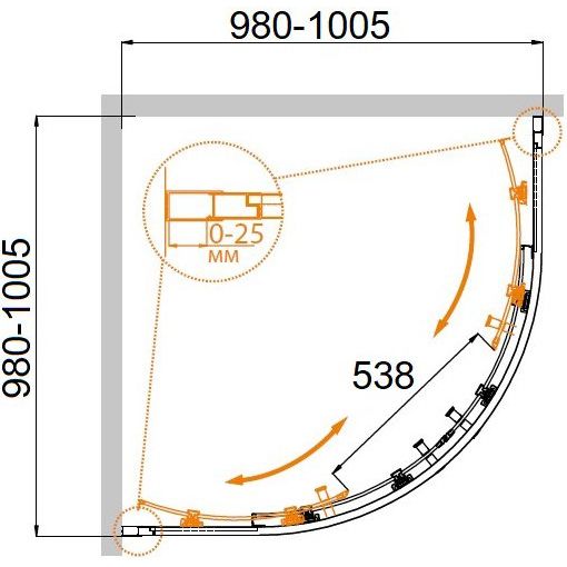 Перед установкой обращайте внимание на возможность монтировать уголок без поддона, так как он не входит в комплект поставки. Регулируемая ширина и раздвижные двери позволяют комфортно адаптировать изделие под индивидуальные параметры пространства вашей ванной комнаты. Убедитесь, что приобретённый поддон соответствует размерам и стилю душевого уголка.