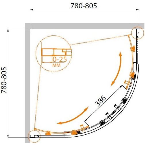 Габариты душевого уголка составляют 80x80 см, он позволяет регулировать ширину от 780 до 805 мм благодаря боковым профилям. Раздвижная система дверей и ширина входа в 38,5 см делают его удобным и практичным решением. Уголок можно установить как пристенно в угол, так и на поддон, который приобретается отдельно.
