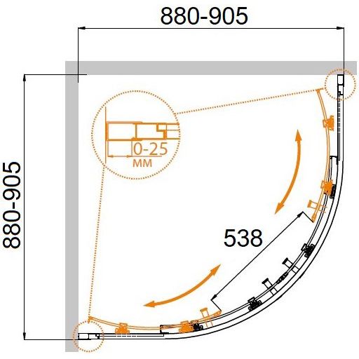 Душевой уголок имеет размеры 90x90 см, что делает его идеальным выбором для средних ванных комнат. Система раздвижных дверей оснащена двойными подшипниковыми роликами, обеспечивающими надежность и долговечность. Алюминиевый и хромированный профиль не только придают изделию современный вид, но и защищают от коррозии. Регулируемая ширина (880-905 мм) позволяет адаптировать уголок под ваши уникальные условия ванной комнаты. Важная деталь: ширина входа составляет удобные 53.8 см.