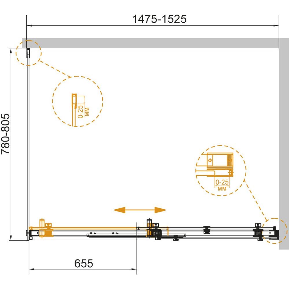Душевой уголок оснащен алюминиевыми профилями с глянцевой хромированной отделкой, что придаёт изделию современный внешний вид. Раздвижные двери с прозрачным полотном не только создают ощущение лёгкости, но и увеличивают визуальное пространство. Уголок предназначен для напольного монтажа или установки на поддон, который приобретается отдельно. При этом предусмотрена регулировка ширины (155x80 см) и ширина входа составляет 65.5 см, что обеспечивает удобный доступ.