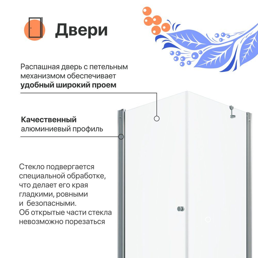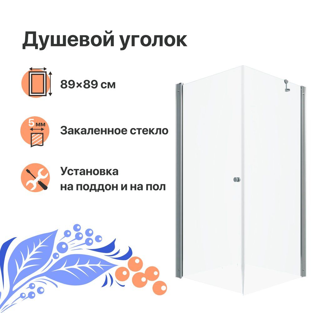 Душевой уголок DIWO \"Переславль 90х90\" имеет размеры 89x89 см и подходит для напольного или поддонного монтажа в угол. Двери выполнены из прозрачного закаленного стекла с толщиной 5 мм и обеспечивают комфортный вход шириной 78 см. Алюминиевый профиль покрыт хромом, создающим изысканный глянцевый эффект. Компактный стабилизатор аналогичного оттенка поддерживает конструкцию, обеспечивая безопасность и стабильность.