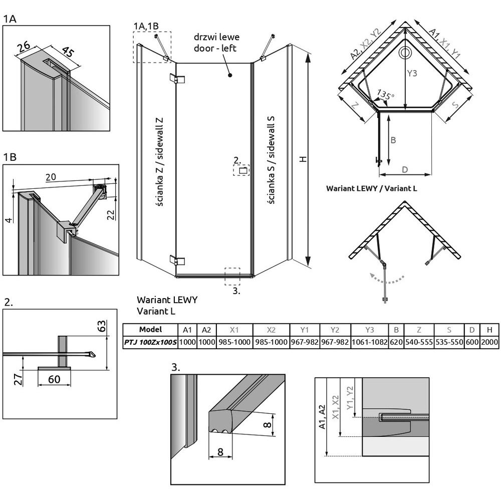 Эта модель имеет размеры 100x100 см, подходит для установки на пол без поддона, что делает её идеальной для современных интерьеров. Распашные двери из прозрачного стекла придают легкость конструкции, а алюминиевый профиль с матовой черной поверхностью подчеркивает стиль и элегантность. Благодаря регулируемой ширине и глубине в диапазоне 98.5-100 см, душевой уголок легко адаптируется к вашим нуждам. Ширина входа составляет 60 см, обеспечивая удобство входа и выхода. Магнитный уплотнитель гарантирует герметичность даже при перепадах температуры и влажности.