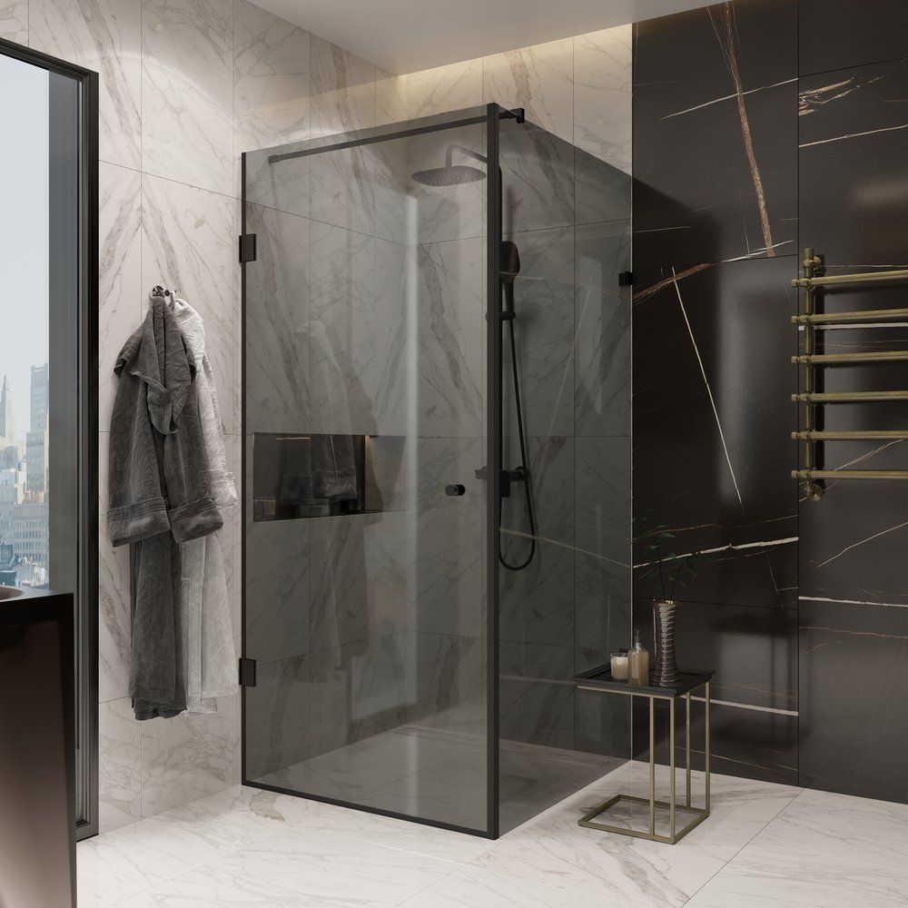 Душевой уголок с размером 90x90 см выгодно разместится в уголке ванной комнаты. Имеет прочный алюминиевый профиль с матовой черной отделкой. Дверцы выполнены из тонированного стекла, что обеспечивает уединенность и комфорт. Ширина входа в 85 см делает его удобным для использования. Установка возможна прямо на пол или на поддон — выбор за вами.