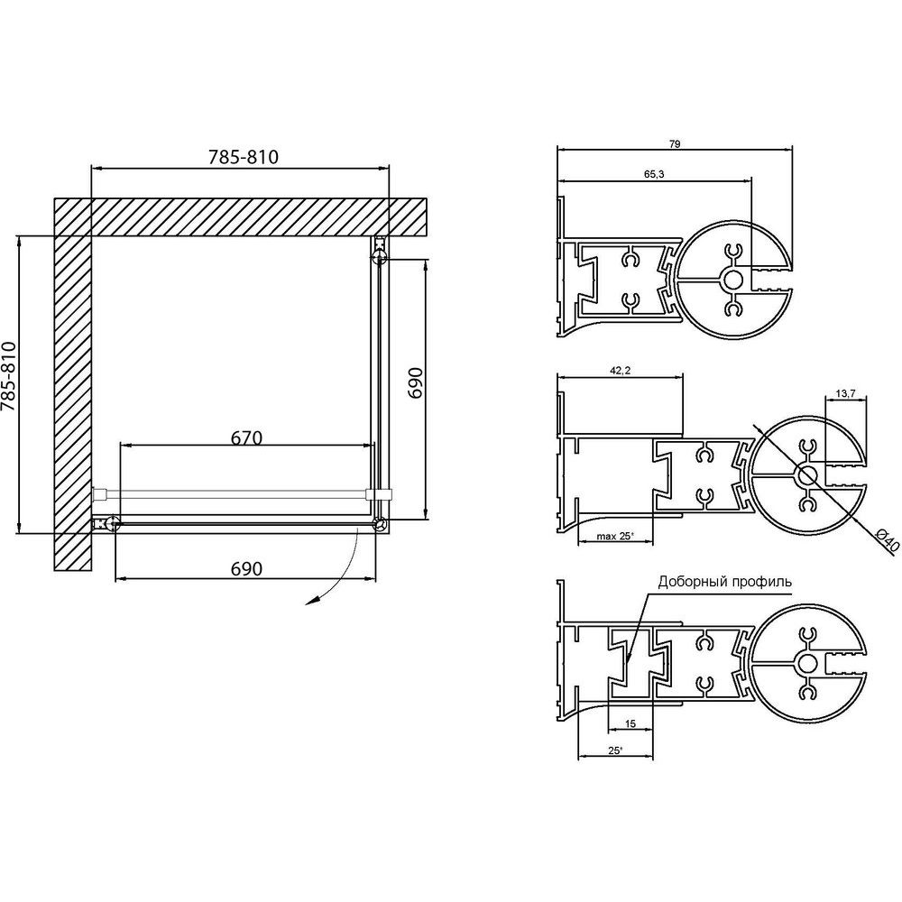 Душевой уголок имеет габариты 80x80 см, что идеально подходит для небольших помещений. Установка возможна как на плитку, так и на поддон, что позволяет гибко подходить к монтажу. Ширина входа составляет 67 см, а матовый алюминиевый профиль добавляет конструкции устойчивость и безопасность при эксплуатации.