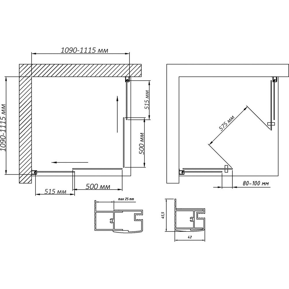 Душевой уголок имеет возможность регулировки ширины и глубины от 109 до 111,5 см, обеспечиваемой выдвижением профиля. Угловая модель, размещающаяся на полу без поддона, оснащена раздвижной системой дверей из прозрачного полотна. Прочный алюминиевый черный матовый профиль гарантирует долговечность и устойчивость конструкции. Вход составляет 57.5 см в ширину, что достаточно удобно для любой ванной комнаты. Производится в России и обладает гарантией сроком на 2 года.