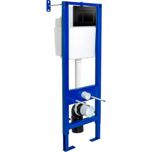 Система инсталляции Berges Atom 410 представляет собой комплект, включающий смывной бачок и кнопку смыва. Крепление осуществляется в капитальную стену и пол, что обеспечивает максимальную надежность конструкции. Дизайн предусматривает механическую кнопку смыва, выполненную в черном цвете, и экономный слив с кнопками для полного и частичного слива. Бачок объемом 3 и 8.5 литров имеет верхний подвод воды и диаметр слива 9 см.