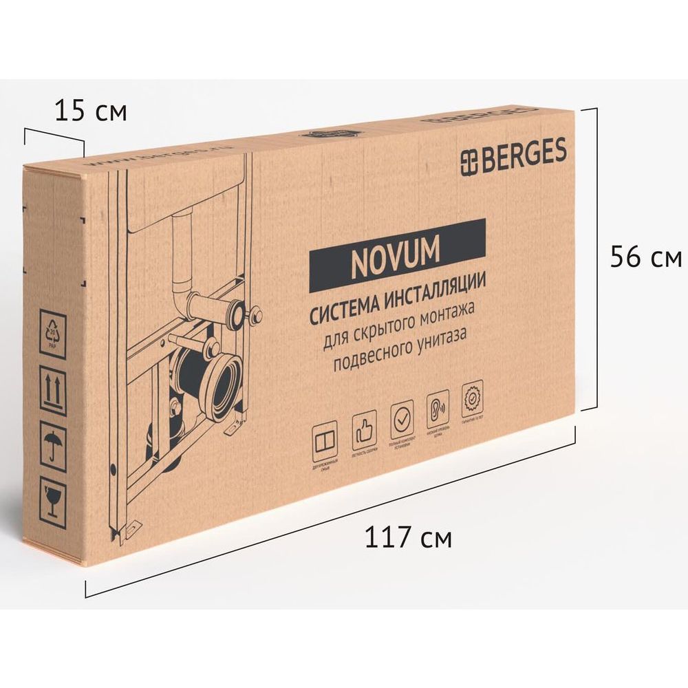 Система инсталляции Berges Novum 040000 предлагается без кнопки смыва, но уже включает смывной бачок с объемом 3 и 6 литров. Она крепится в капитальную стену и пол, обеспечивая надежность конструкции. Подвод воды осуществляется сверху, а диаметр слива составляет 9 см. Монтажные размеры удобны для установки: высота — 115 см, межосевое расстояние под крепежные шпильки — 18 / 23 см.