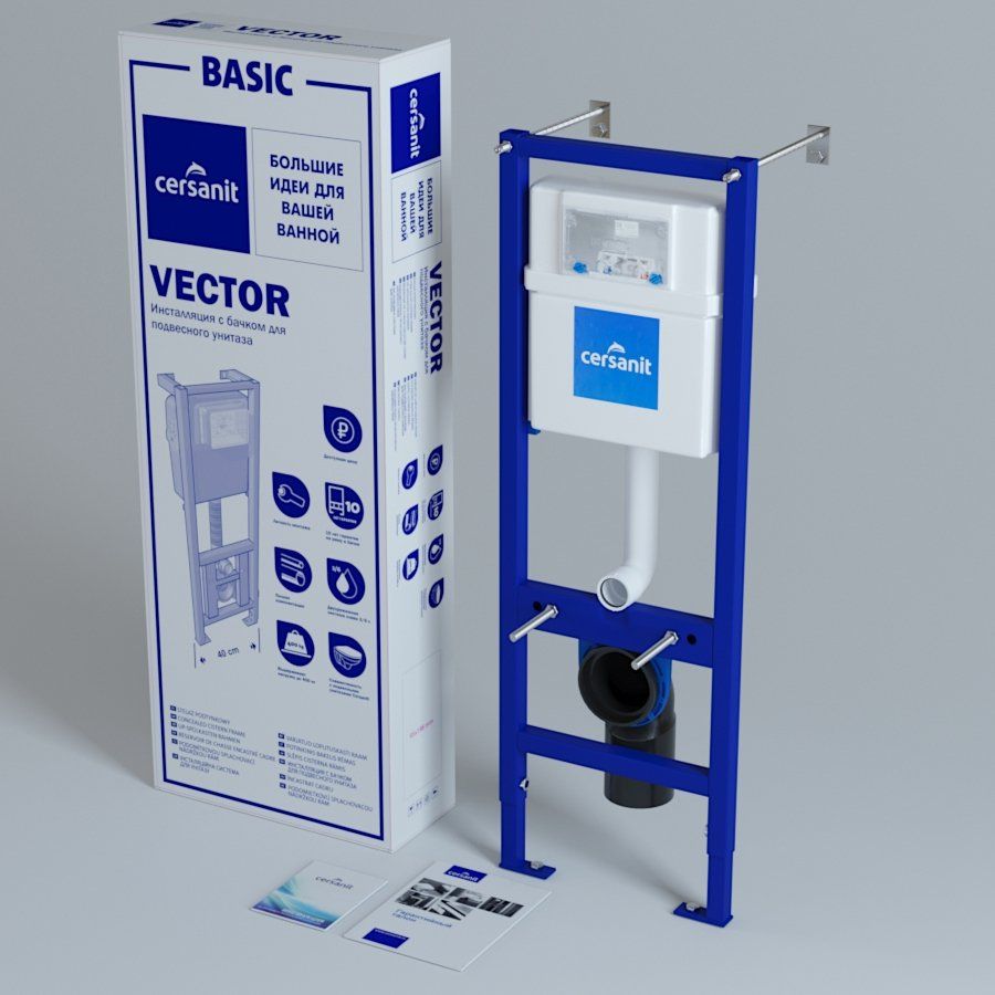 Система инсталляции Cersanit Vector крепится с расчетом на надёжность: она фиксируется как к капитальной стене, так и к полу. Объем смывного бачка регулируется двумя кнопками — для частичного (3 л) и полного (6 л) слива воды, что позволяет экономить ресурсы. Подвод воды осуществляется сбоку, благодаря идеальной интеграции в любой интерьер. Монтажная глубина системы составляет 15.5 см, а высота — 110.5 см, что делает её подходящей для большинства унитазов. Межосевое расстояние для крепежных шпилек имеет варианты в 18 и 23 см, а диаметр слива составляет 9 см. Комплект включает в себя качественный смывной бачок и матовую кнопку из пластика, произведённую в Польше. Габариты кнопки: ширина 22.2 см, высота 15 см, глубина 1.3 см. Сервисный срок — 3 года гарантии.