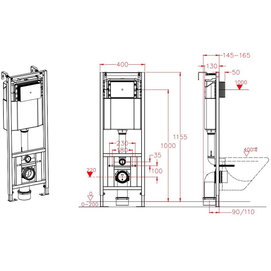 Эта система инсталляции крепится в капитальную стену и пол, что обеспечивает максимальную устойчивость. Оснащена механической кнопкой смыва с эргономичным дизайном в черном цвете. Экономный слив реализован через две кнопки – для полного (6 л) и частичного (3 л) слива бачка. Вода подводится сверху, диаметр слива составляет 9-11 см. Конструкция позволяет настраивать высоту установки унитаза, а межосевое расстояние под крепежные шпильки варьируется в пределах 18 и 23 см. Монтажная глубина составляет 13 см, а высота – 135.5 см.