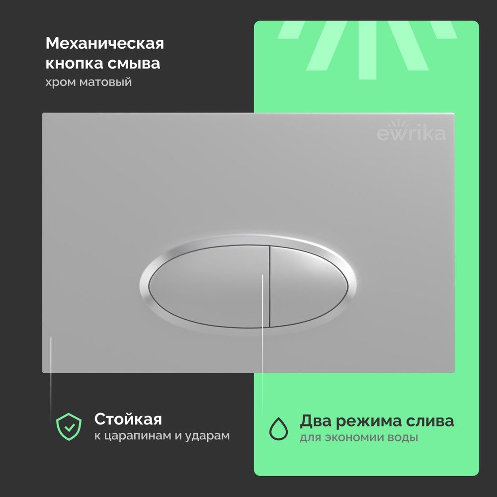Кнопка смыва EWRIKA 0050 размером 26x16.7 см и глубиной 1.3 см рассчитана на более чем 100 000 нажатий. Она легка в установке, бесшумна в работе и приятно ощущается на ощупь. Турецкое качество подтверждено гарантийным сроком в 2 года.