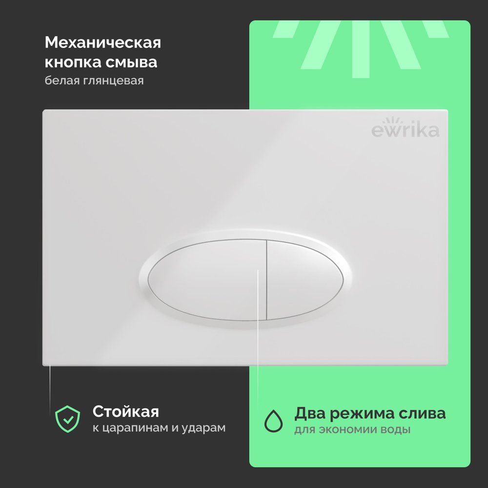 Кнопка смыва EWRIKA 0052 представлена в стильном белом матовом цвете, изготовлена из износостойкого пластика и рассчитана на более 100 тысяч нажатий. С размерами 26x16.7 см и глубиной 1.3 см, она легка в монтаже и устойчива к механическим повреждениям, таким как царапины и удары.