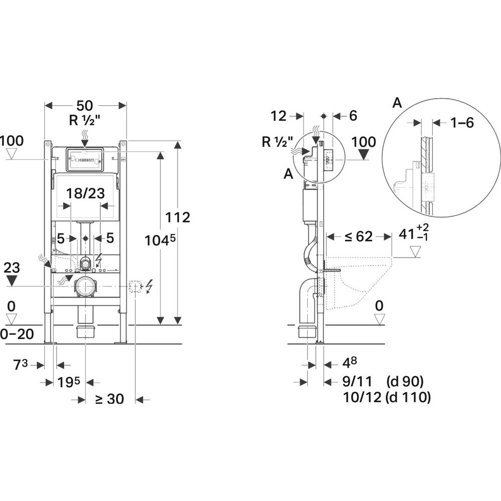 Данная инсталляция крепится в капитальную стену и пол, что обеспечивает стабильность и безопасность. Смывной бачок с диаметром слива 9 см и подводом воды возможен как сверху, так и сзади. Инсталляционная глубина составляет 12 см, а монтажная высота — 112 см, что позволяет установить систему в большинстве стандартных санузлов. Для крепежных шпилек предусмотрено межосевое расстояние 18 или 23 см. Смывной бачок включен в комплект, что упрощает установку и эксплуатацию.