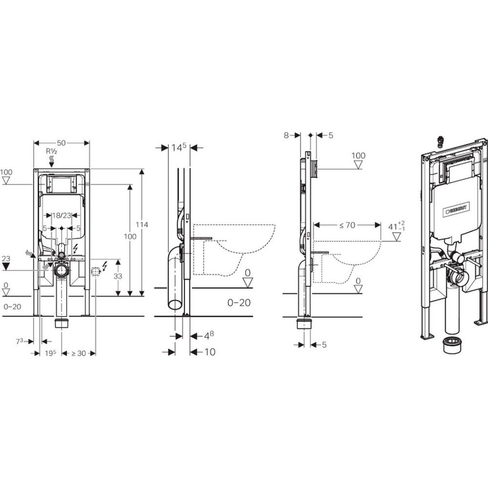 Эта система инсталляции поддерживает несколько объемов смыва: 3 и 4.5, 3 и 7.5, 3 и 6, 4 и 6, 4 и 7.5, 4.5 и 6, а также 4.5 и 7.5 литра. Подвод воды осуществляется сверху, обеспечивая удобную интеграцию с водопроводной системой. Диаметр слива составляет 9 см, что гарантирует эффективный и быстрый смыв. Компактная монтажная глубина в 8 см и высота в 114 см подойдут для большинства современных ванных комнат. Межосевое расстояние под крепежные шпильки 18/23 см расширяет возможности настройки установки.